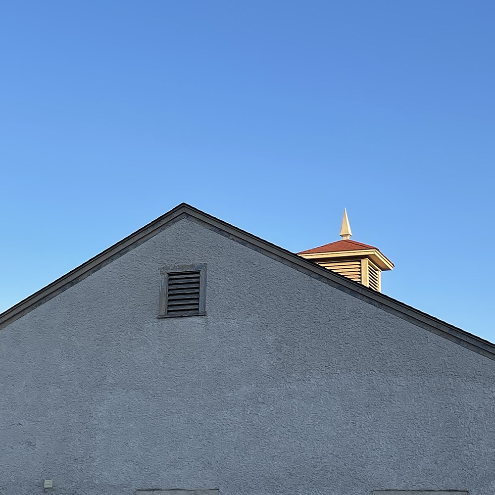 peaked building, blue sky