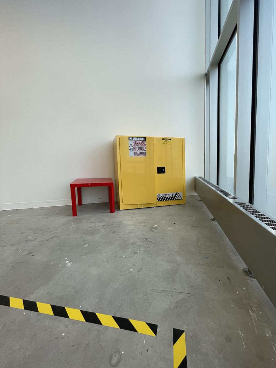 yellow utility cupboard and red table